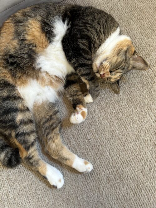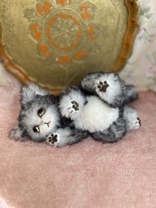 寝てる写真しかなかった~。きりっとした顔をするときがあってそんな感じになったと思いました。体長23㎝くらいでお腹にはステンレスボールとペレットで少し重みを出してます。肉球も2色使いです。