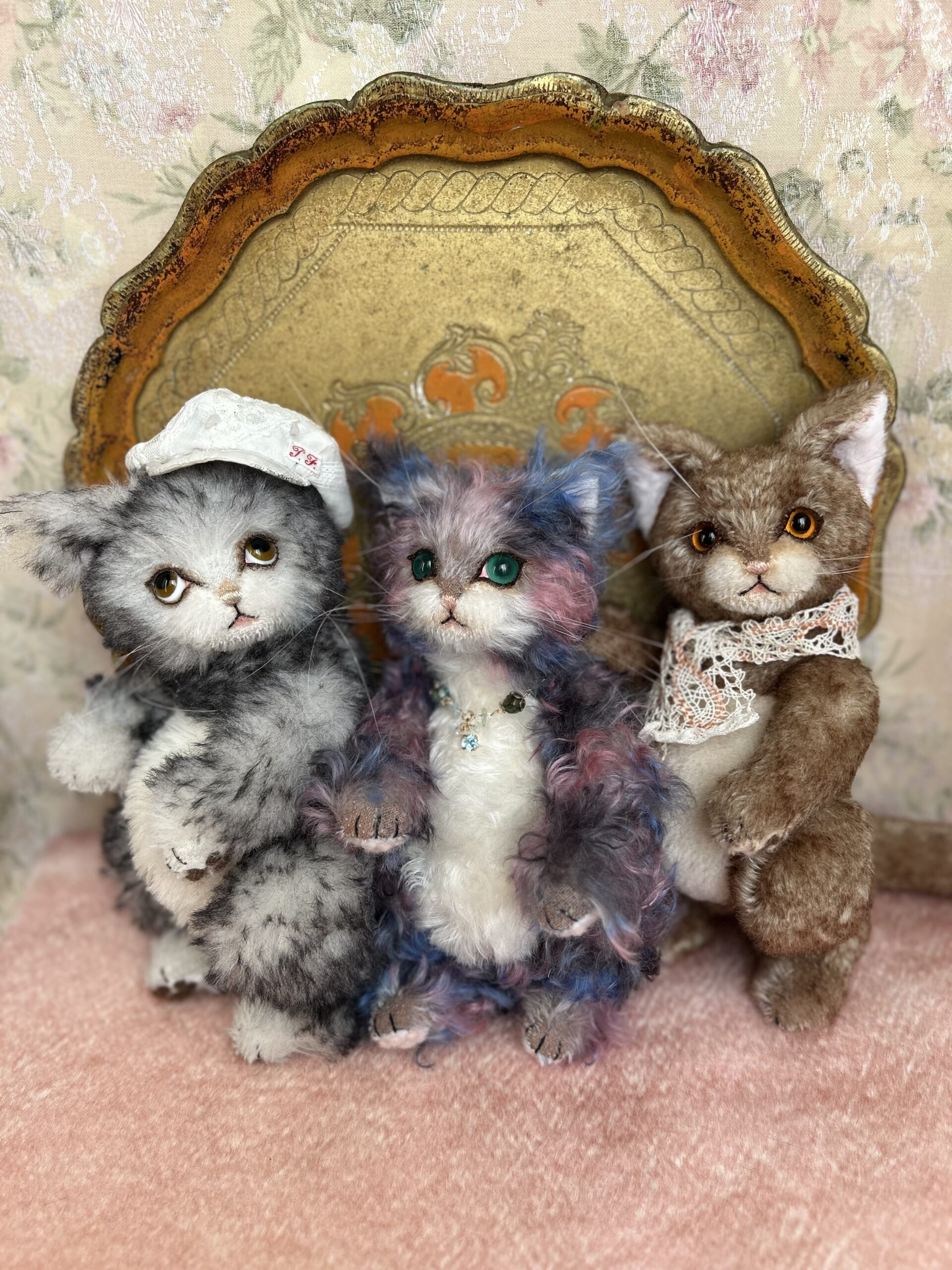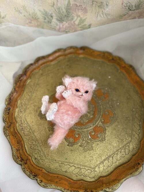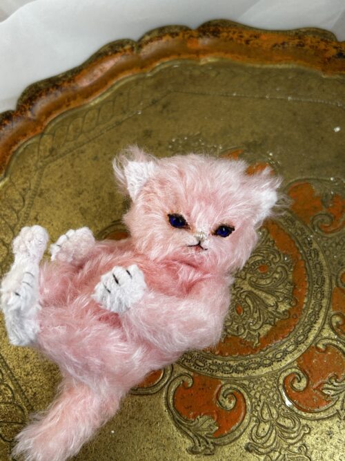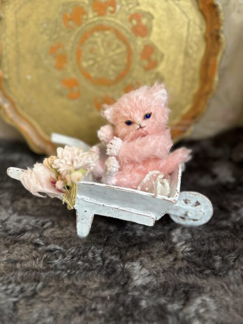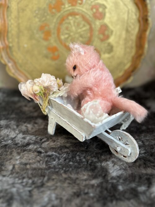 この荷車もついてますよ。これは夫が木材で作ってくれました。色もシャビーにしてほしいという私の要望通りに塗ってくれました!ちゃんと動きますよ☆このピンクベビにゃんはいちごのイメージで作りました。収穫したら荷車で運んだりするよねという妄想からこのような感じになり遊べるし楽しい仔になりました。アンティークレースと布花がついてます。体長は15㎝くらいで小さくて手の中で丸くなれる仔です。腕にはワイヤーを入れてますので少し動かせます。